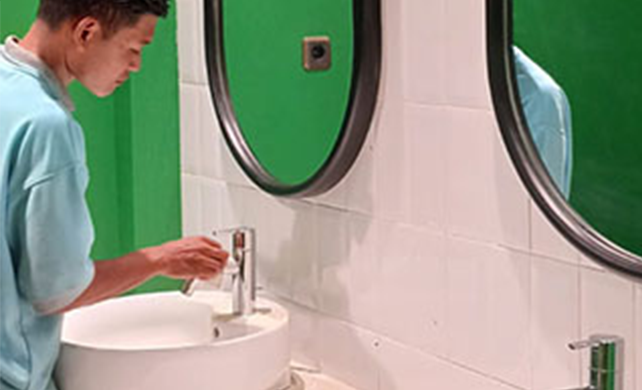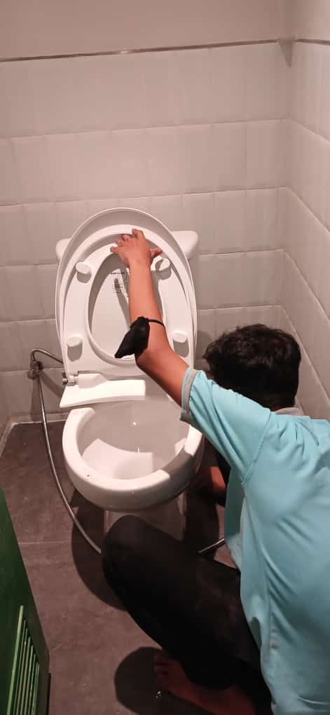 Pembersihan kamar mandi & toilet secara menyeluruh seperti kloset, keramik, dan lantai agar bebas kerak dan licin.